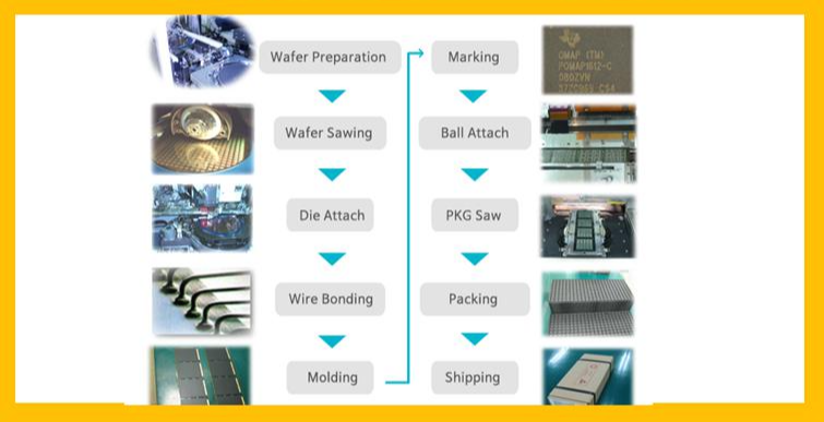- 테스트, 금속배선, 성형 공정으로 이루어짐