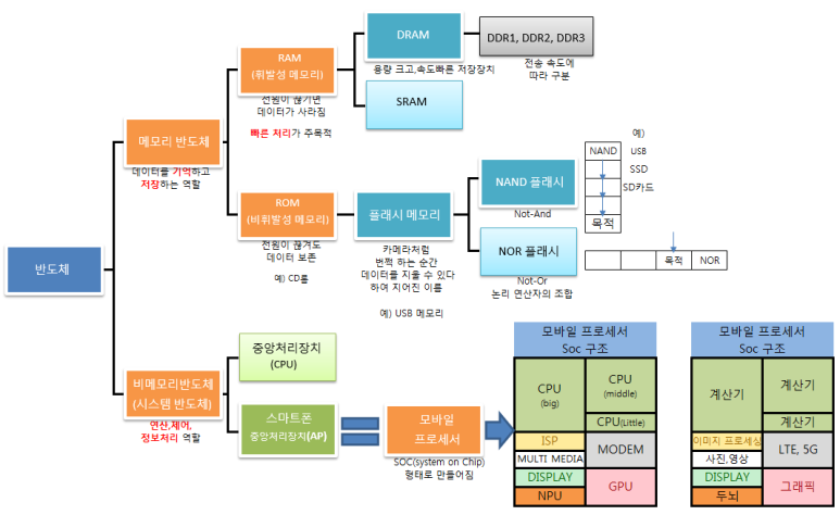 - 시스템 반도체: 계산 목적의 반도체로서 CPU, GPU, AP, DDI 등