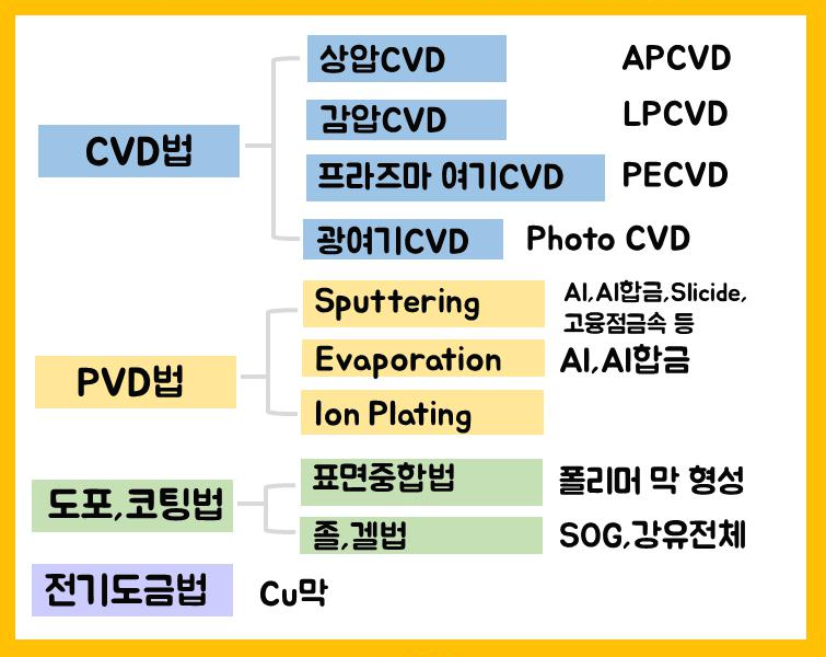 - 화학적 기상증착방법(CVD): 가스의 화학 반응으로 형성된 입자들을 외부 에너지가 부여된 수증기 형태로 쏘아 증착시키는 방법. 도체, 부도체, 반도체 박막증착에 모두 사용가능.