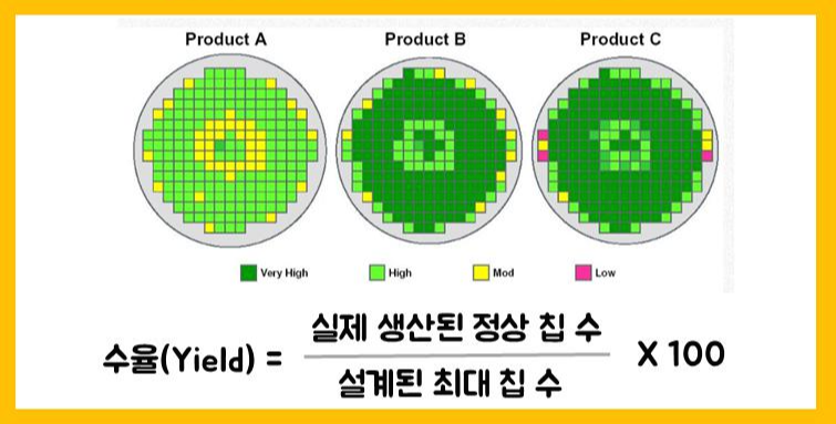 - EDS 테스트 : 제조공정을 거친 반도체 칩을 테스트를 통해 양, 불량을 선별하게 되는 과정. 박막 증착이 끝난 단계에서 행함. 이 때 수율이 매우 중요함.