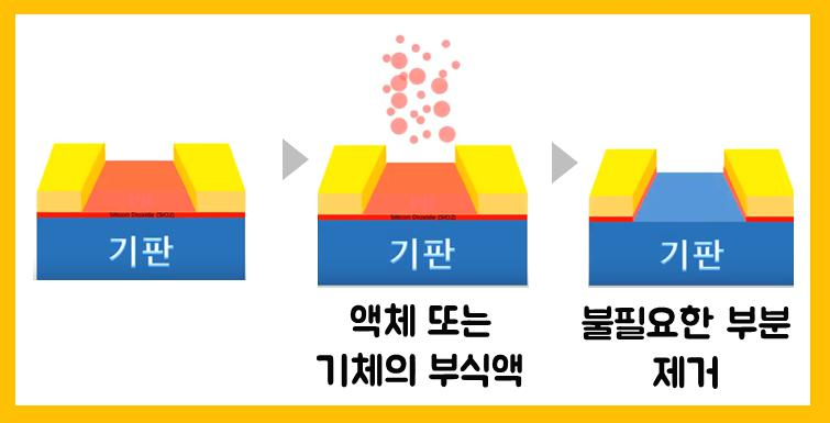 ▶ 식각 공정 : 회로 패턴을 제외한 나머지 부분을 제거하는 공정으로 세정을 함께 진행 (습식과 건식으로 나뉨)