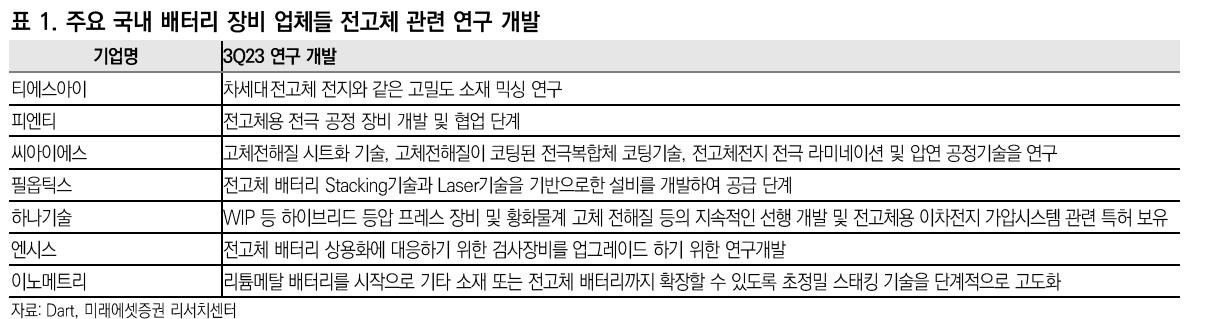 장비 업체들의 경우, 기존 밸류체인에서의 협업이 계속 이루어지고 있다는 점이 파악된다. 주요 장비를 선점하는 업체들은 향후 전고체 배터리 장비 시장에서 큰 혜택을 받을 것으로 기대된다.