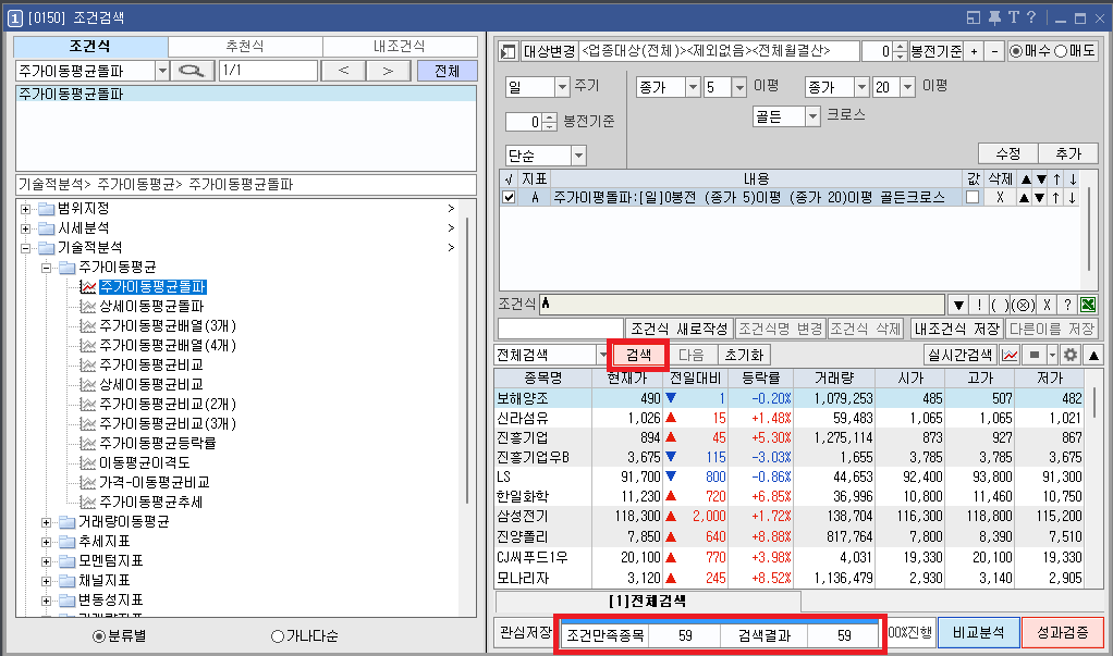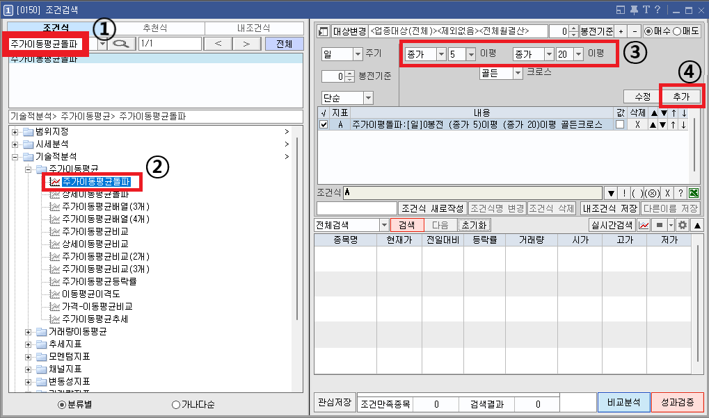 - 조건식 검색란에 '주가이동평균돌파' 입력