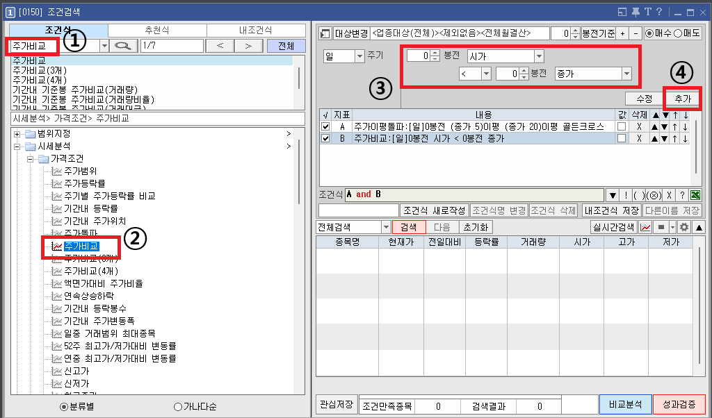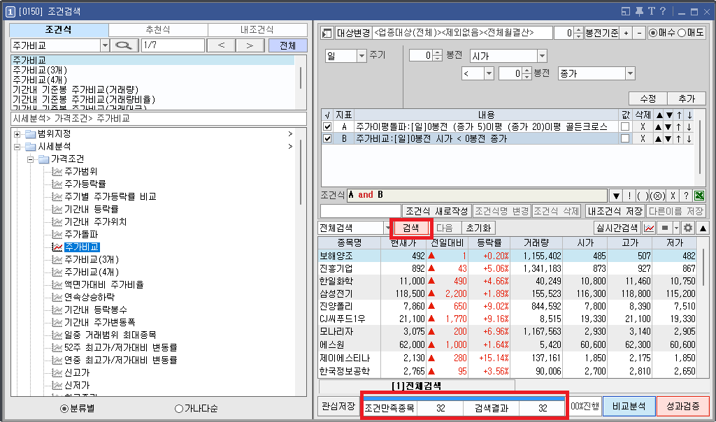 - 좌측 조건식 검색란에 '주가비교' 입력