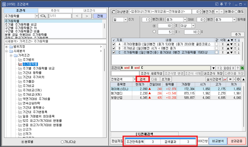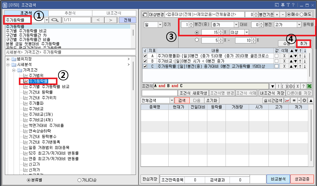 - 좌측 조건식 검색란에 '주가등락률' 입력