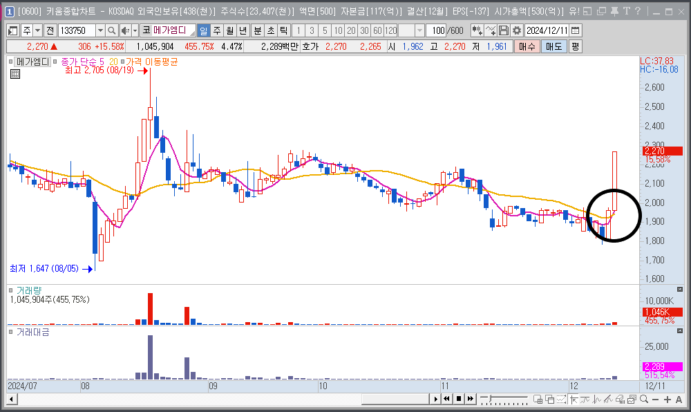 ㆍ 5이평과 20이평 골든크로스 발생했다가 등락률 떨어지면서 이격 살짝 벌어짐