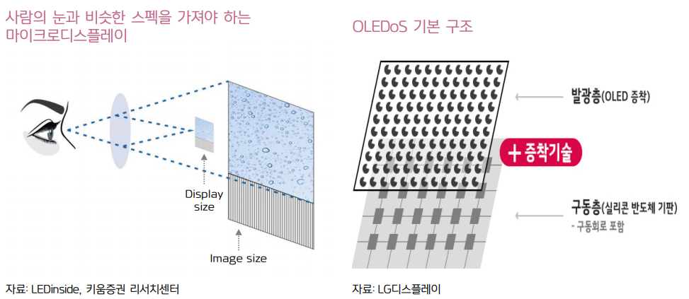 - OLED 소재를 반도체 미세 공정에 접목하여 만든 기술을 'OLEDoS 마이크로디스플레이'라고 할 수 있음