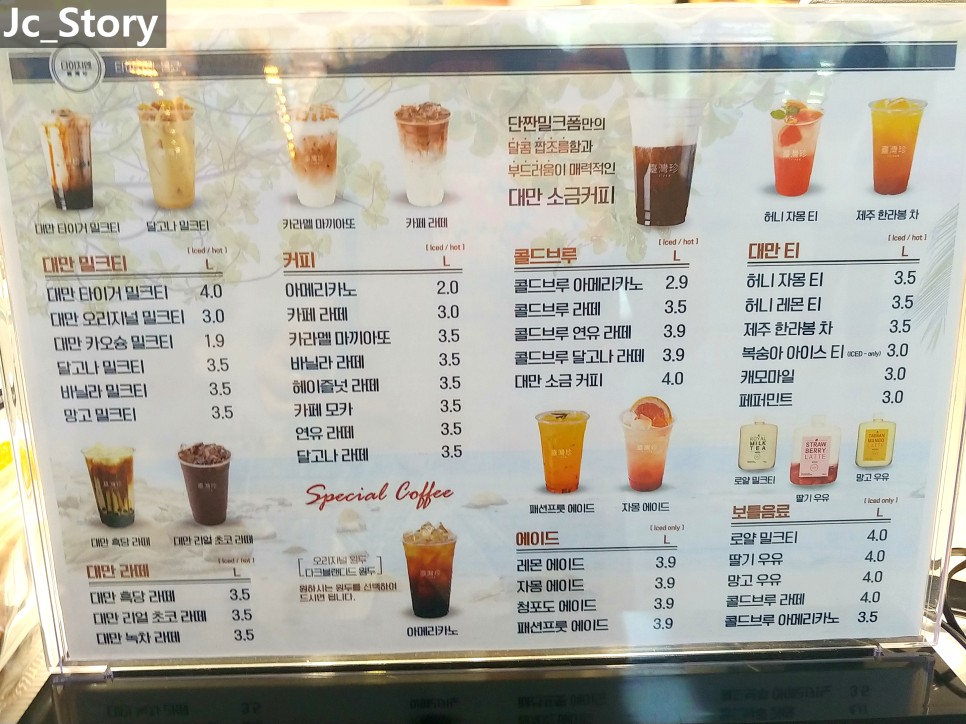 대만 밀크티, 대만 라떼, 커피, 콜드브루, 에이드, 대만티 등이 있습니다.