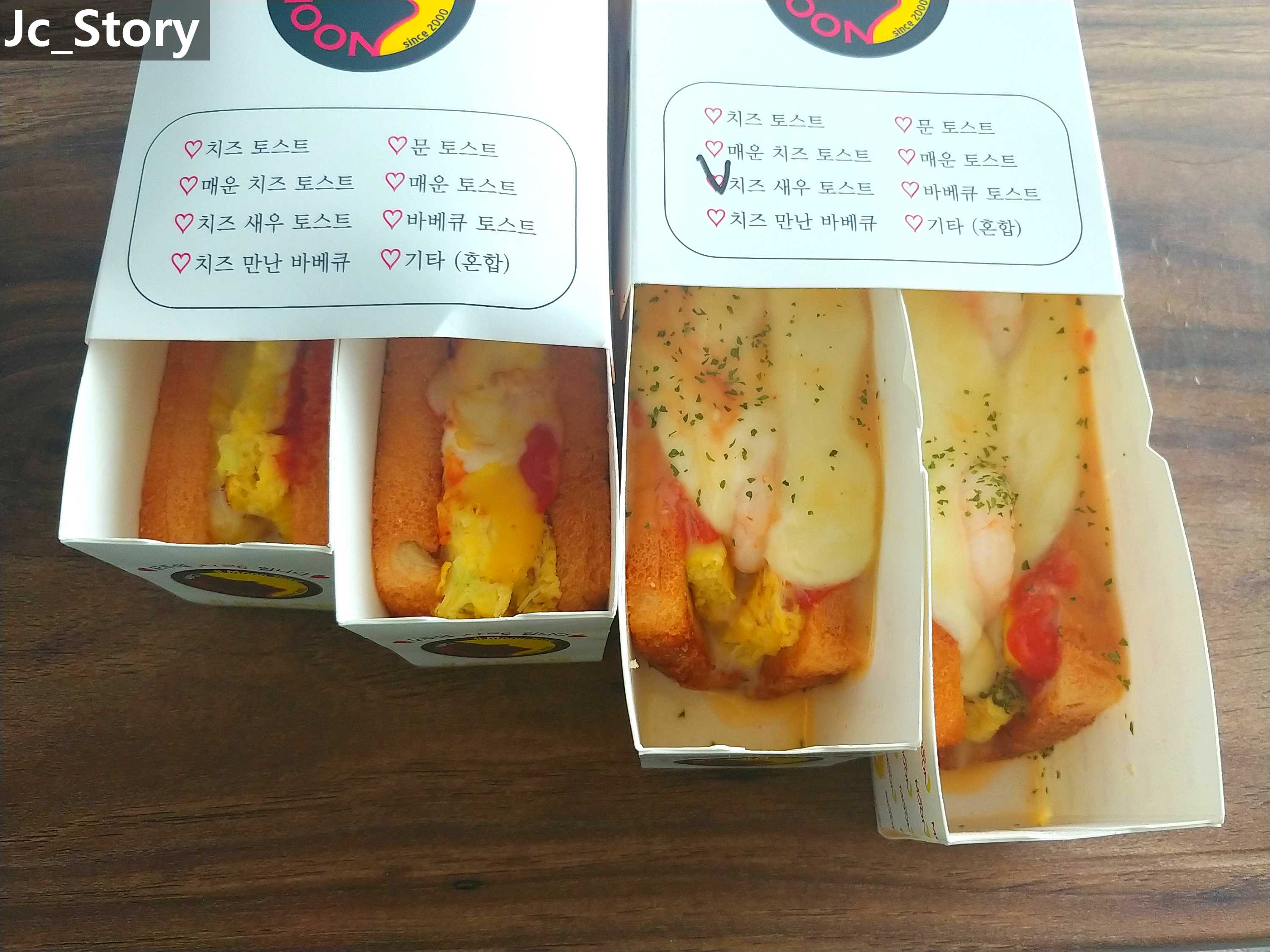 좌측 2개가 문토스트, 우측 2개가 치주새우토스트.