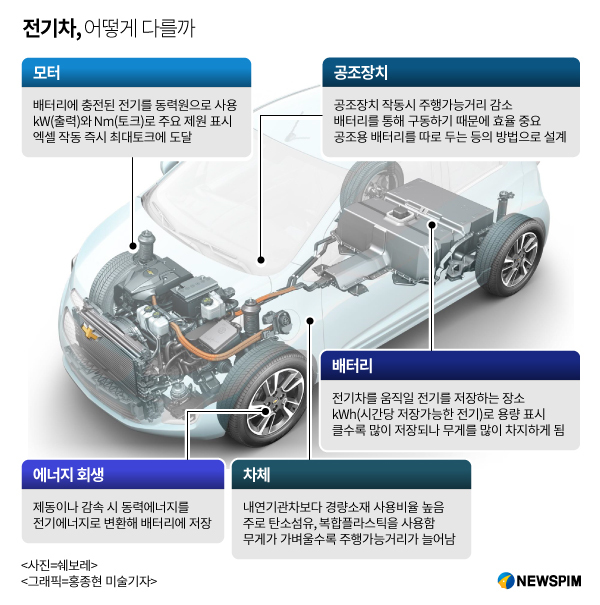 | 연료 저장공간 | 연료탱크에 기름을 저장하는 방식 | 배터리에 전기를 충전해 저장하는 방식 |
