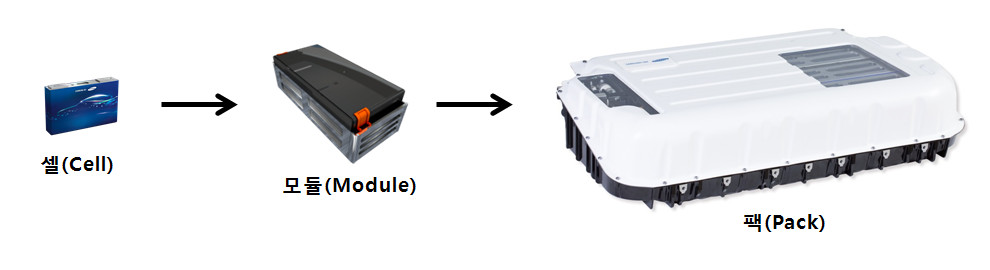 - 배터리를 모으는 단위인 '셀(Cell) → 모듈(Module) → 팩(Pack)'으로 구성