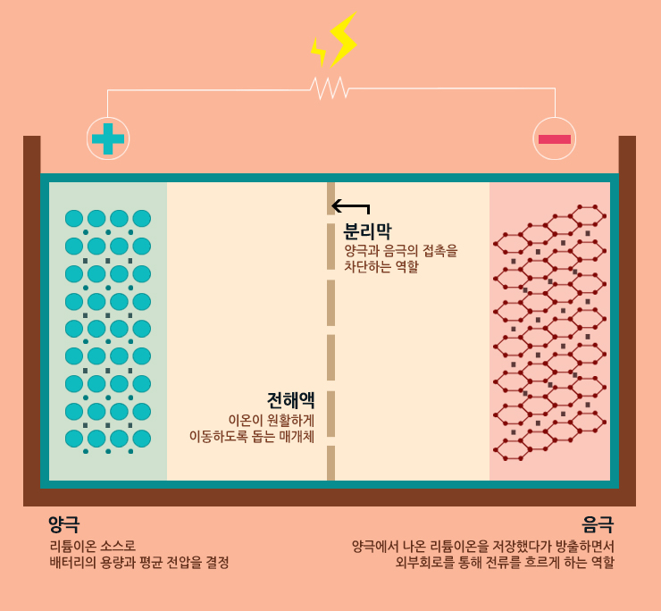 양극재, 음극재, 분리막, 전해질(전해액)로 구성