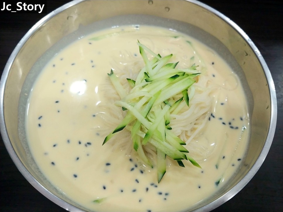 보이는 바와 같이 콩국물, 국수면, 오이채, 검은깨가 다입니다.