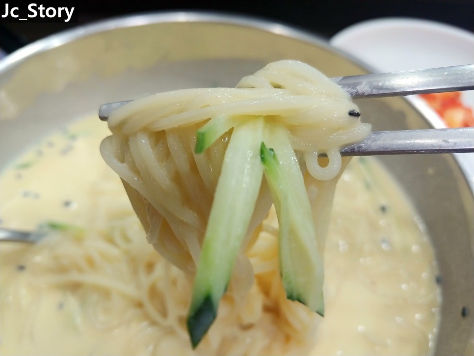 콩 국물을 먼저 먹고 국수를 드셔보시면 조금 싱거운 느낌이 나요.