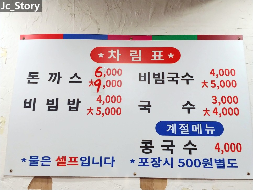 돈까스, 비빔밥, 비빔국수, 물국수, 계절메뉴인 콩국수로 구성되어 있습니다.