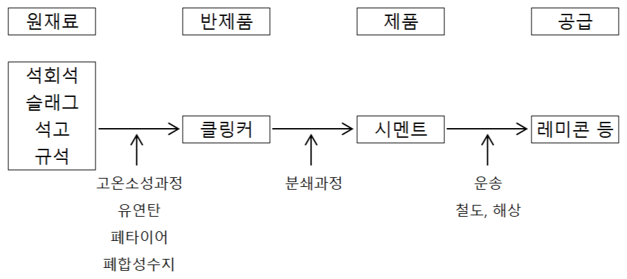 - 글로벌 시멘트 업체들은 유연탄을 대신해 순환자원, 즉 폐비닐, 폐타이어 등을 원료로 태우는 설비를 설치하여 환경오염 문제에 대응하고 있으며 한국 업체들도 본격적으로 유연탄을 순환자원으로 대체하려는 움직임이 빠르게 나타나고 있음