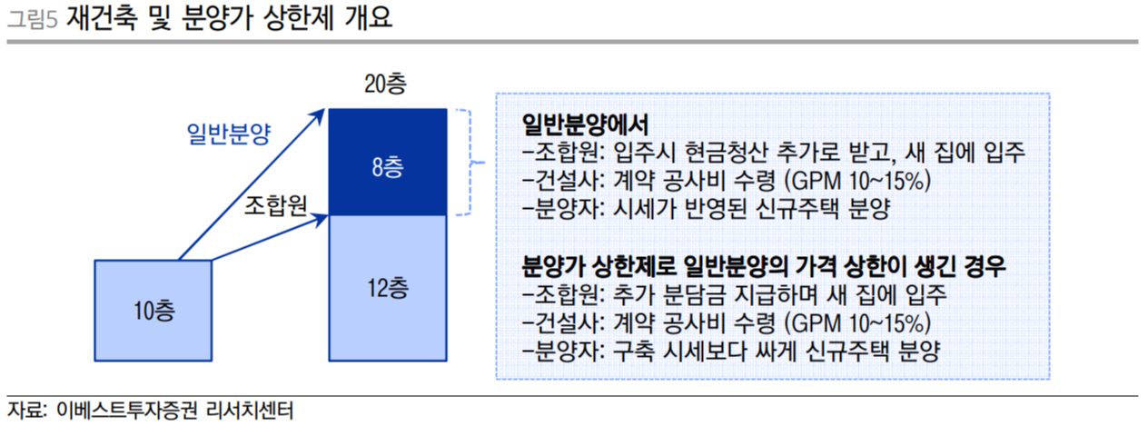 - 일반 분양에서 생기는 수익을 조합원과 건설사가 나눠가지는 것이 재건축임