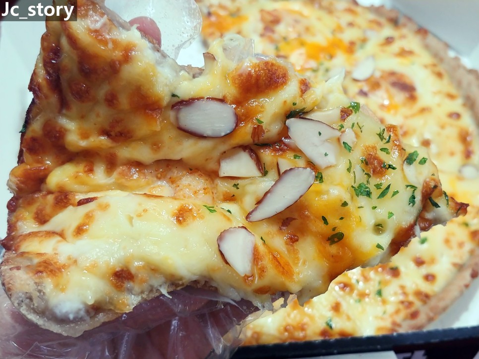 쫀독쫀독한 치즈와 아몬드 그리고 새우가 보이네요.