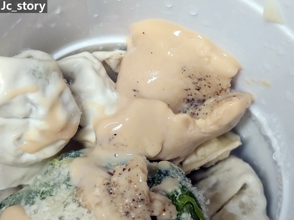 야채블럭 1개와 만두 10알 정도 들어가 있습니다.