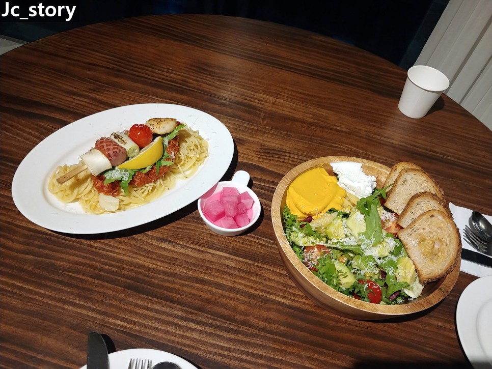 제주 퓨레 샐러드와 모에뜨 토마토파스타로 주문하였습니다.