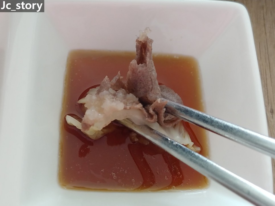 유자 향이 은은하고 부드럽게 넘어가지 못하고, 입 속에 들어가는 순간 향이 너무 강해서 샤브의 맛을 오히려 떨어뜨리는 느낌이었어요.