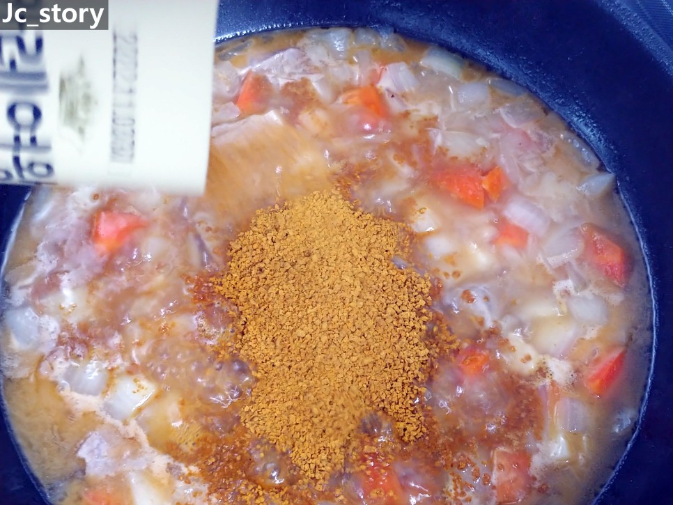 스노우 카레를 한 번에 넣고 저어주세요.